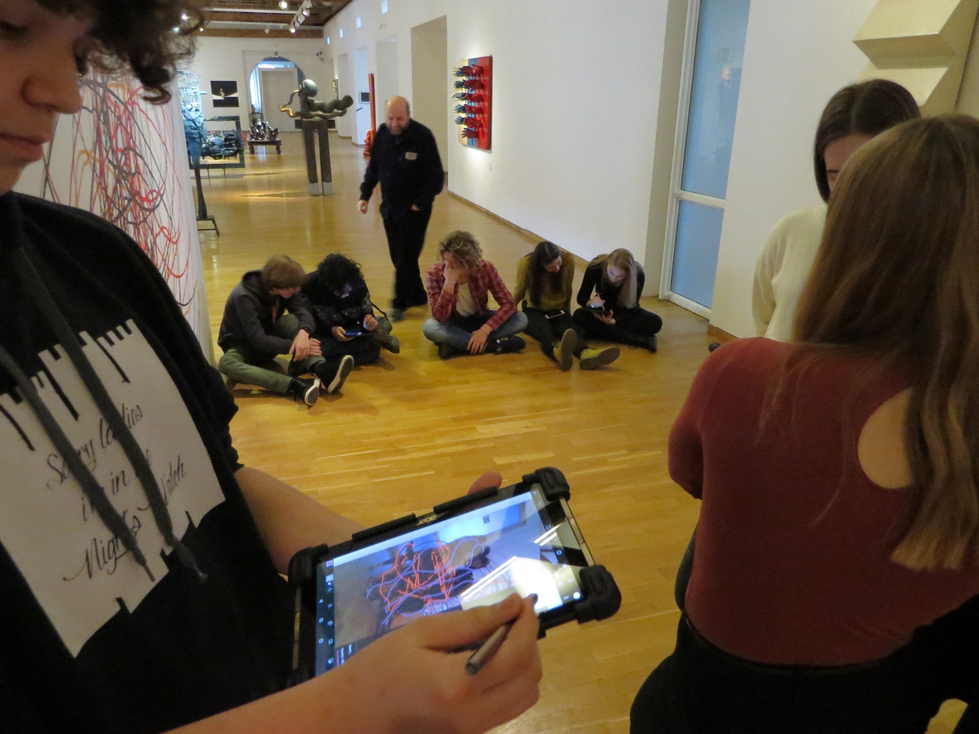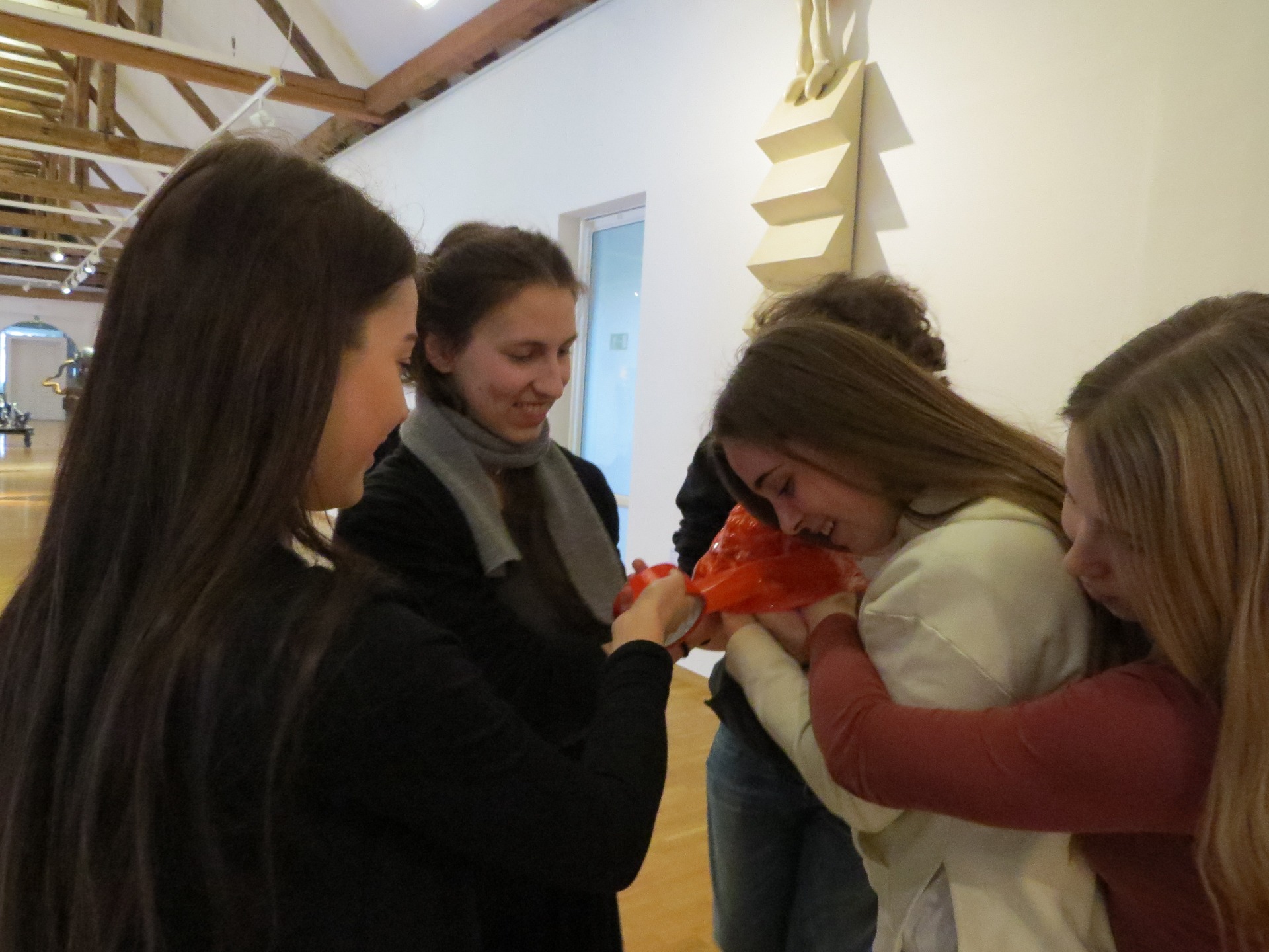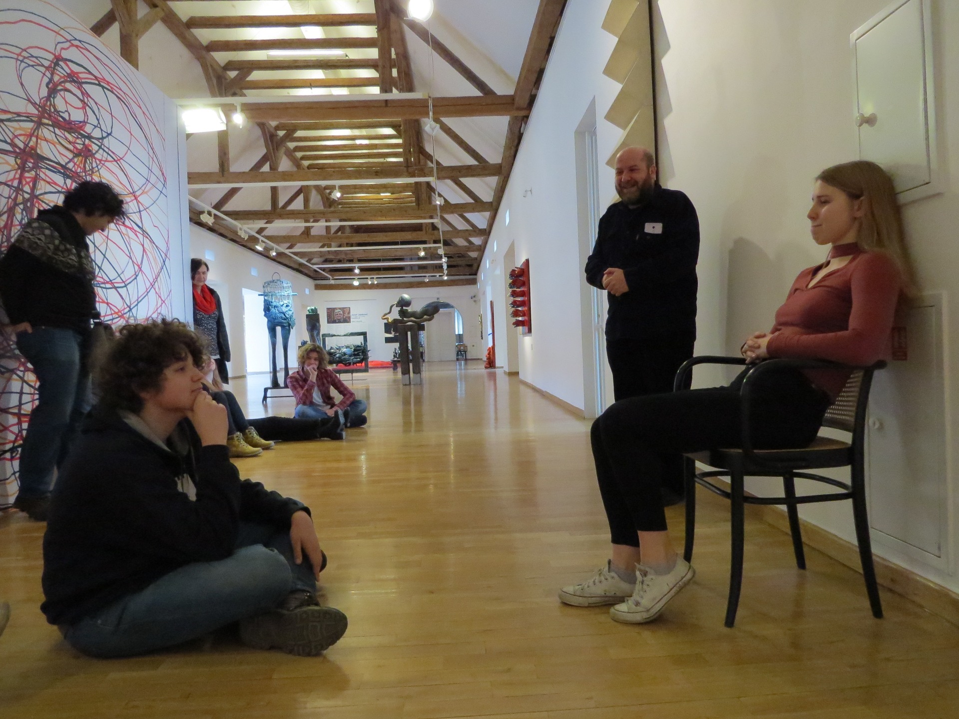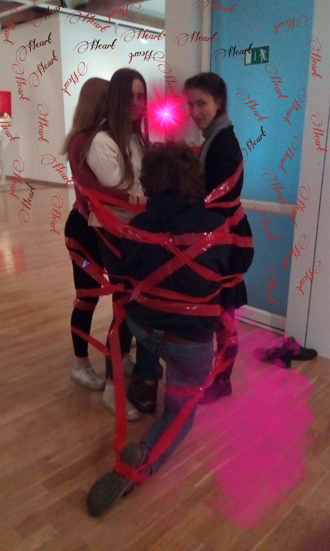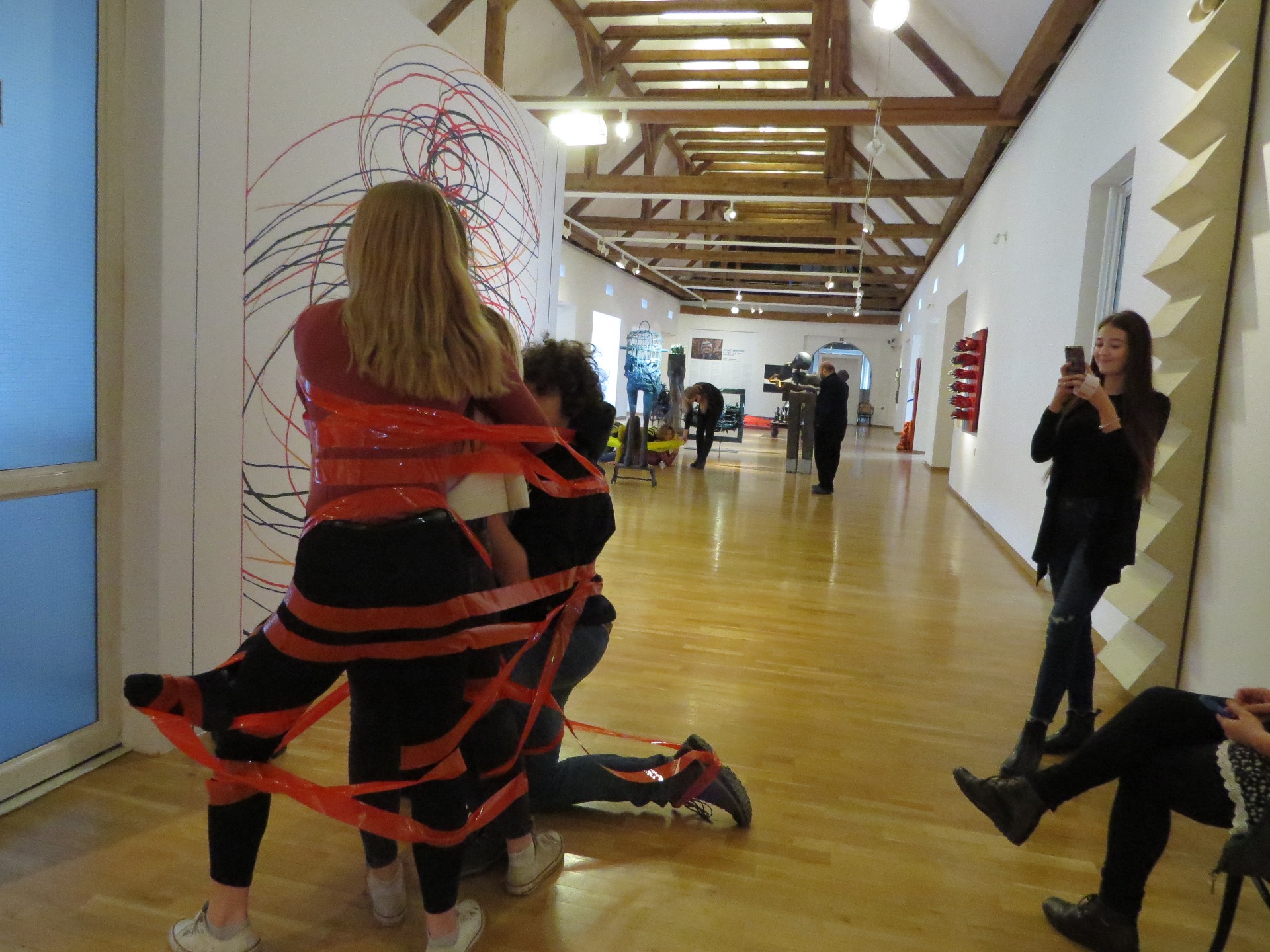 Z důvodu déletrvající reinstalace expozice Století relativity jsme se se studenty věnovali výstavě Jozef Jankovič / Plynutí času. Studenti měli v první fázi za úkol vytvořit sousoší za pomoci vlastních těl a lepicí pásky. Ve druhé fázi dané sousoší vyfotografovat a podívat se na něj s odstupem. Pak pomocí kresby na tablet (s dotykovým perem) vyjádřit pocity ze sevření a deformace; témat vážících se k samotné výstavě.